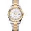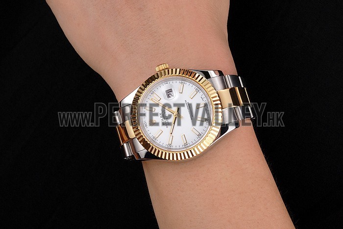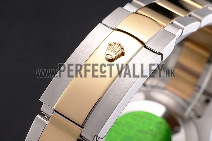 - Bracelet: Brushed stainless steel and 18k yellow gold plated link bracelet with Rolex logo carved fold-in hidden clasp