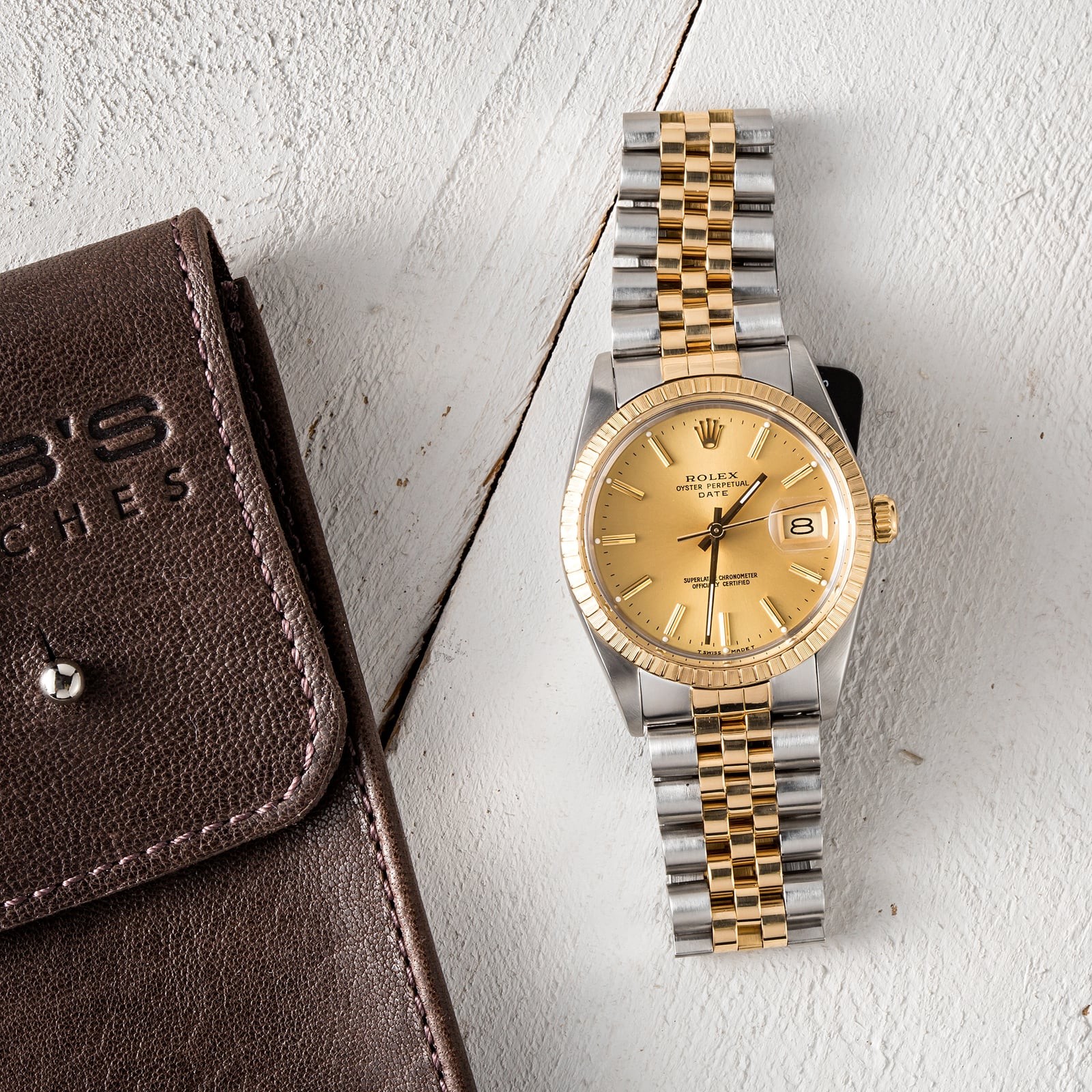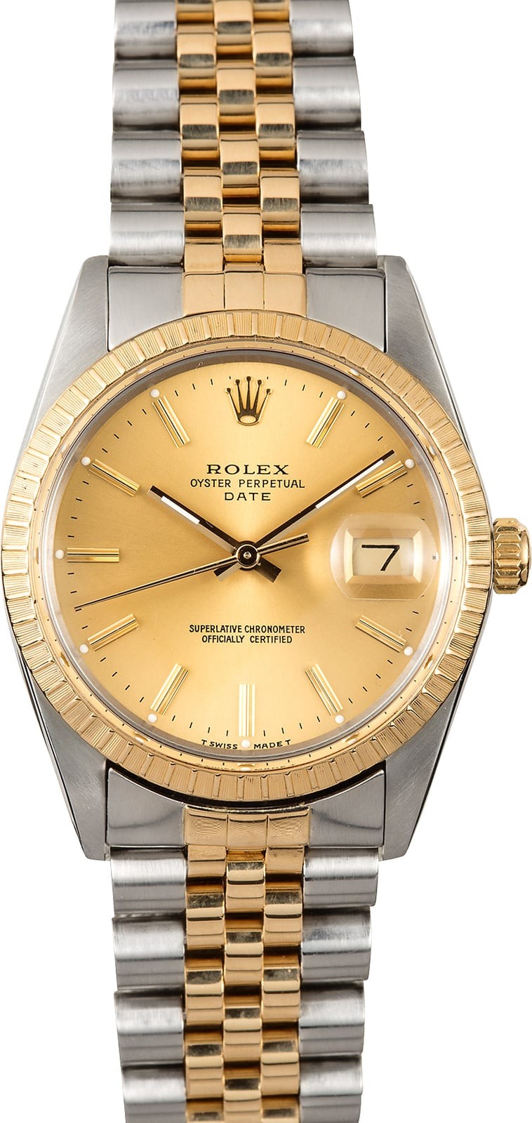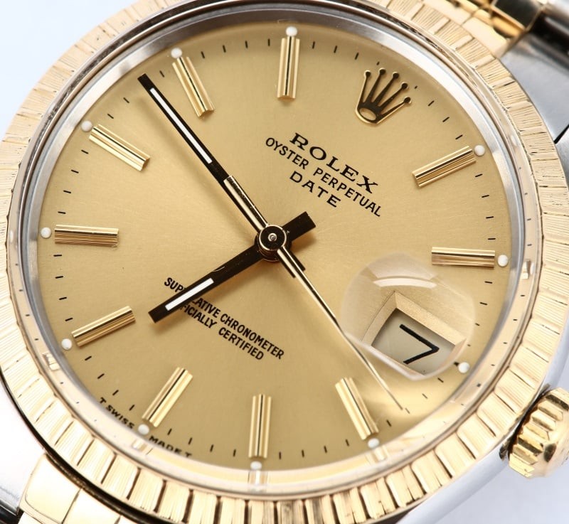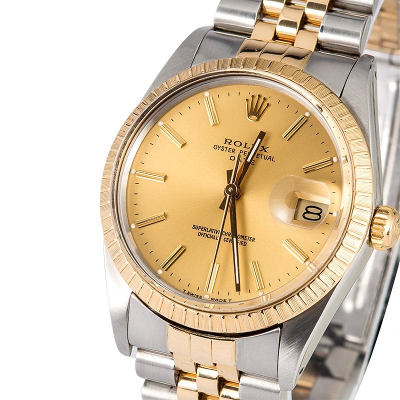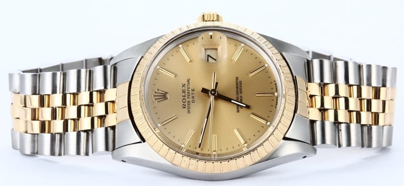 - Case: Stainless steel w/ yellow gold engine-turned bezel (34mm)