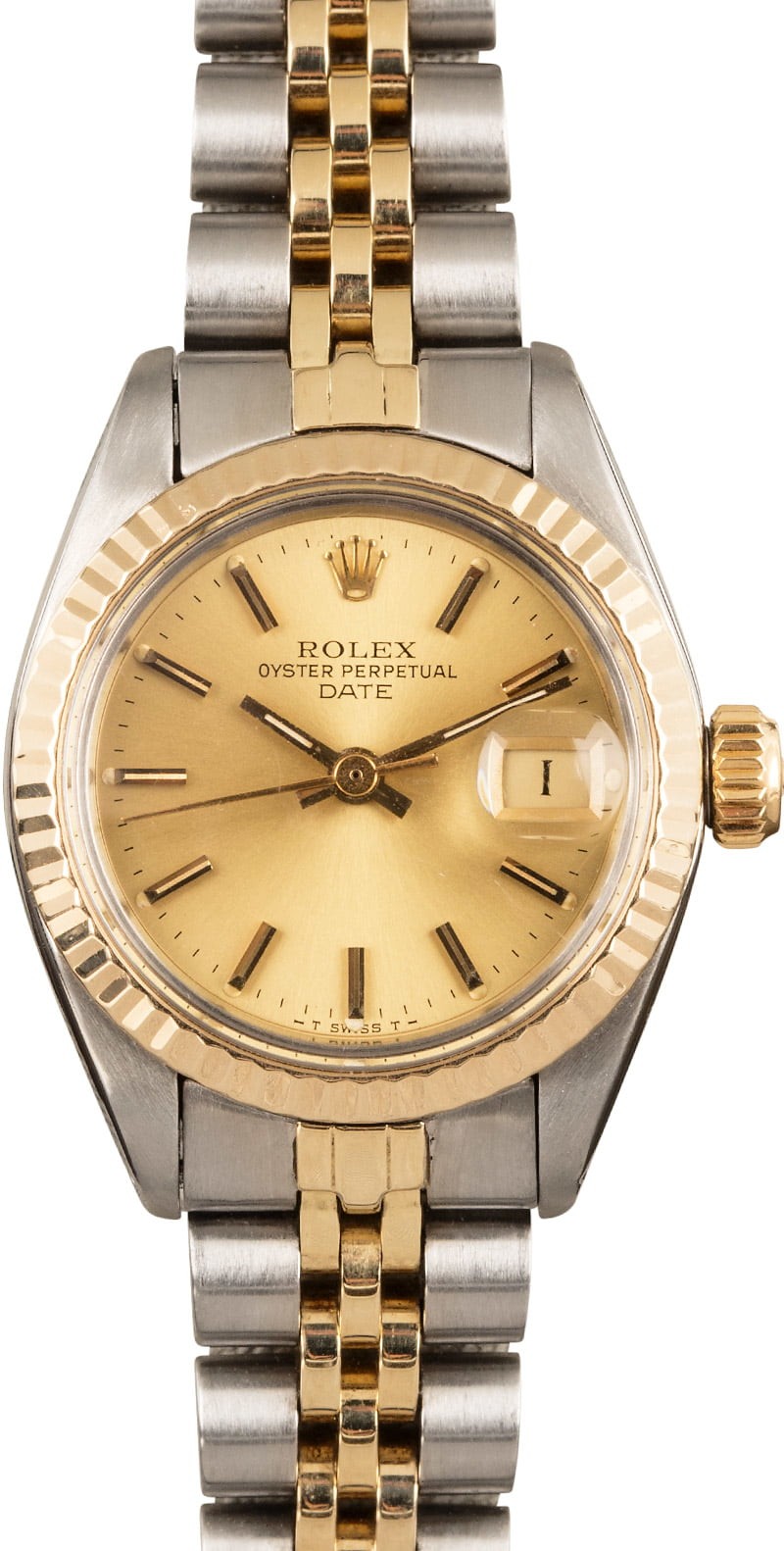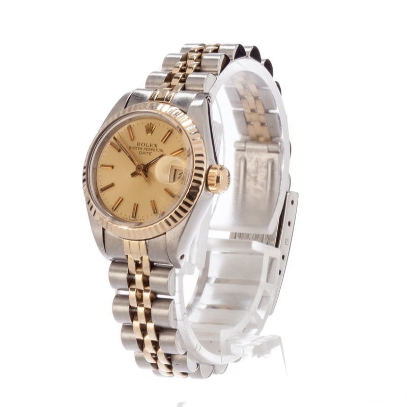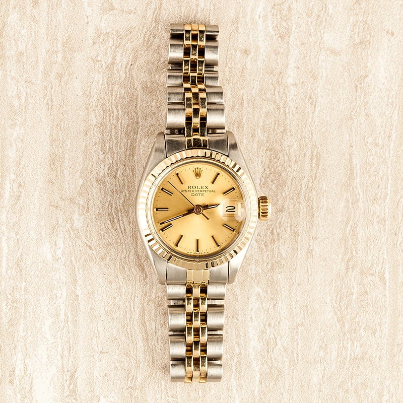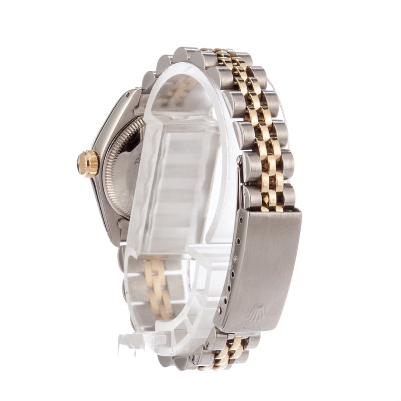 - Case: Stainless steel (26mm) w/ 18k yellow gold Fluted bezel and acrylic crystal
