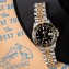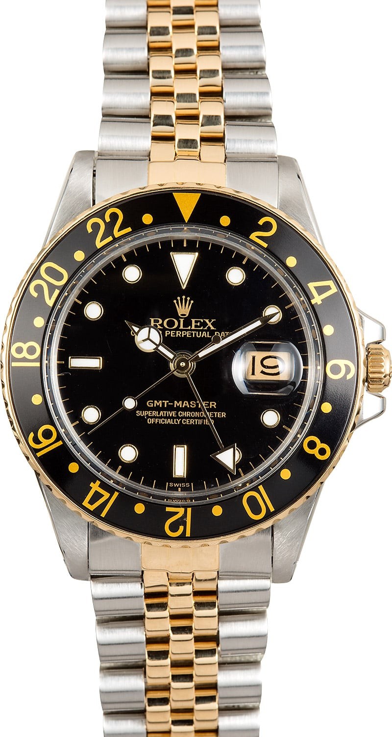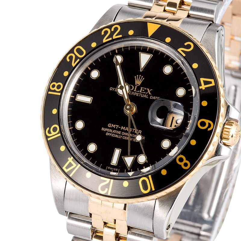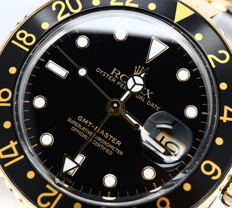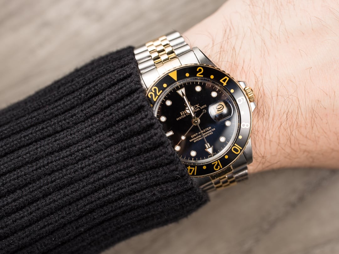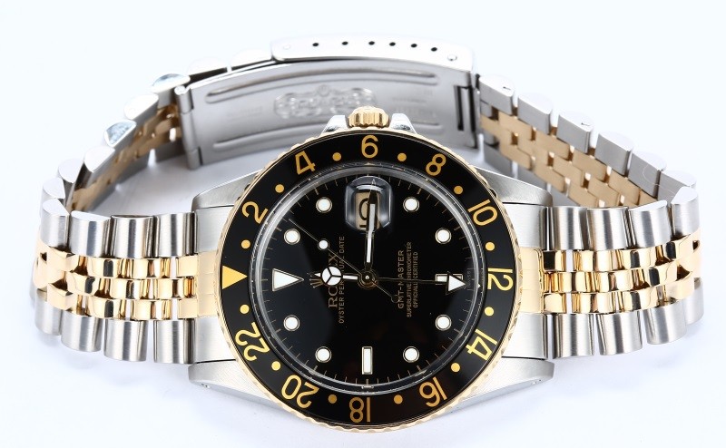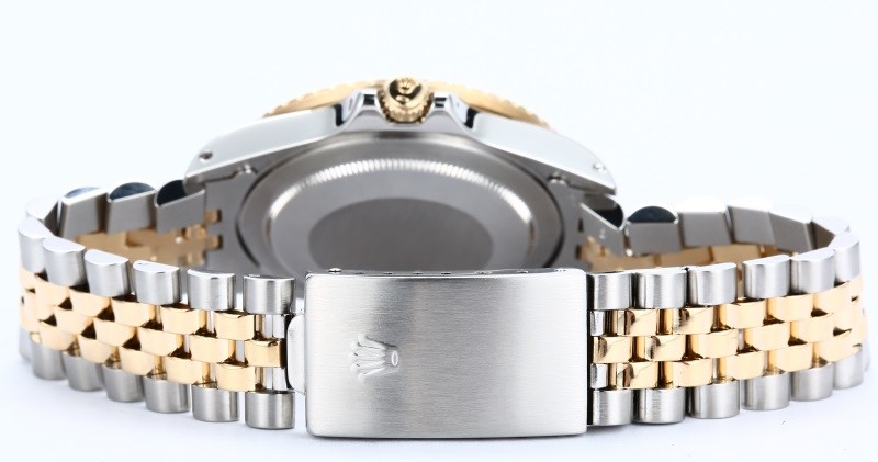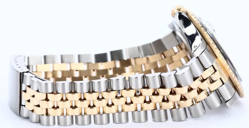 - Case: Stainless steel w/ 18k yellow gold and black bi-directional rotating timing bezel (40mm)