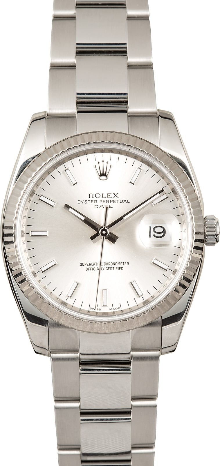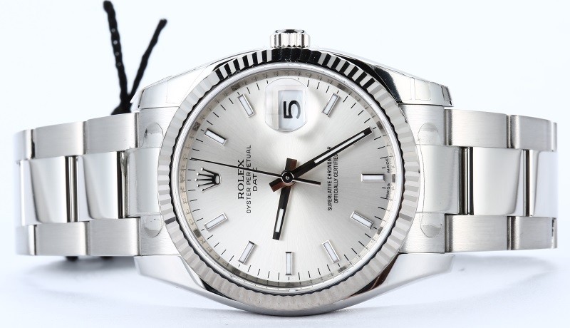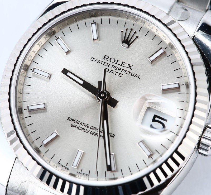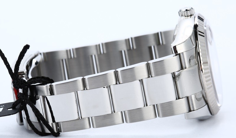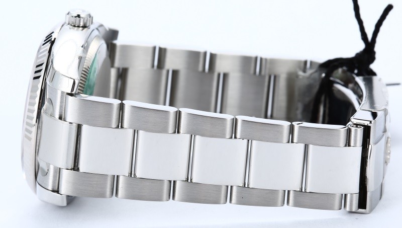 - Case: Stainless steel case w/ 18k white gold fluted bezel (34mm), inner reflector ring engraved w/ serial number