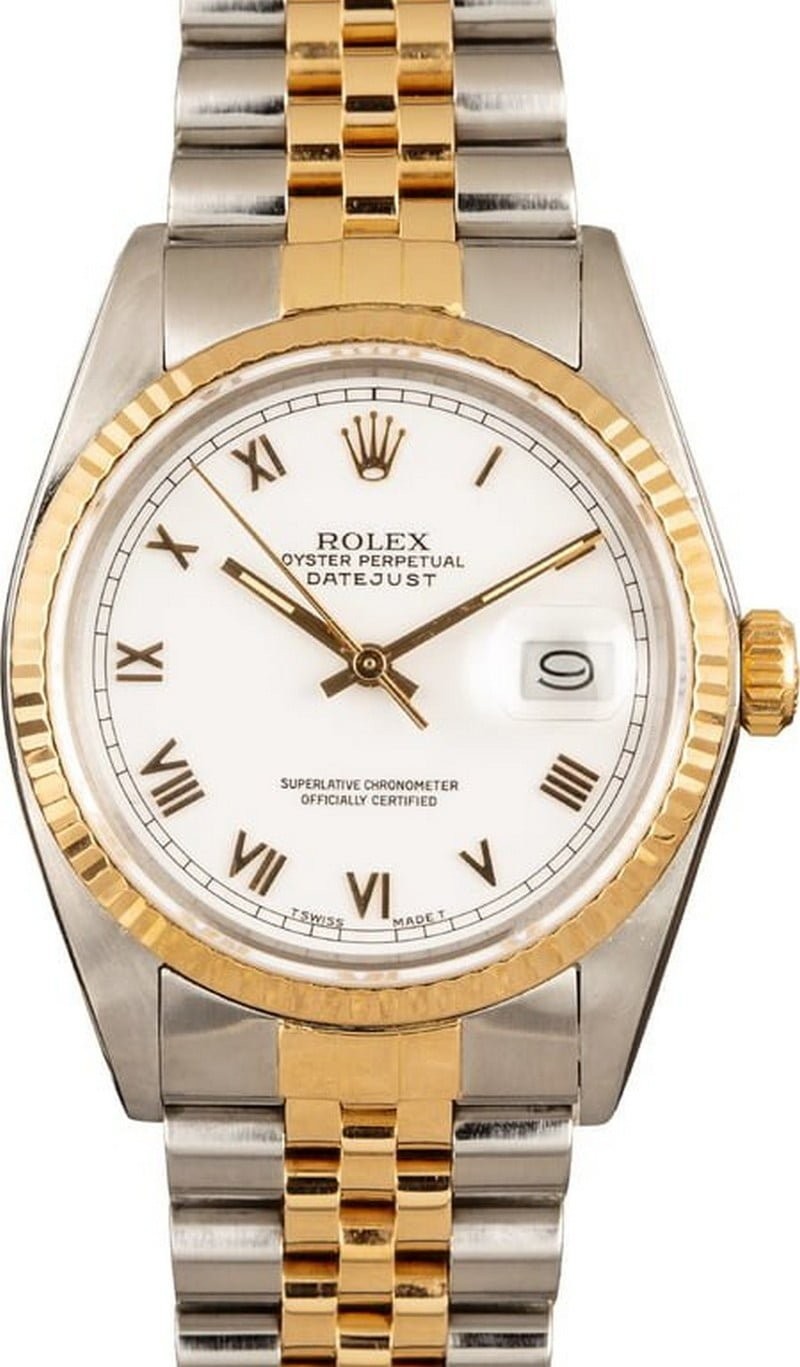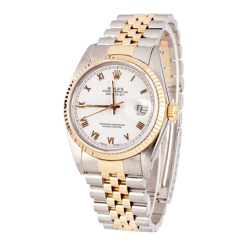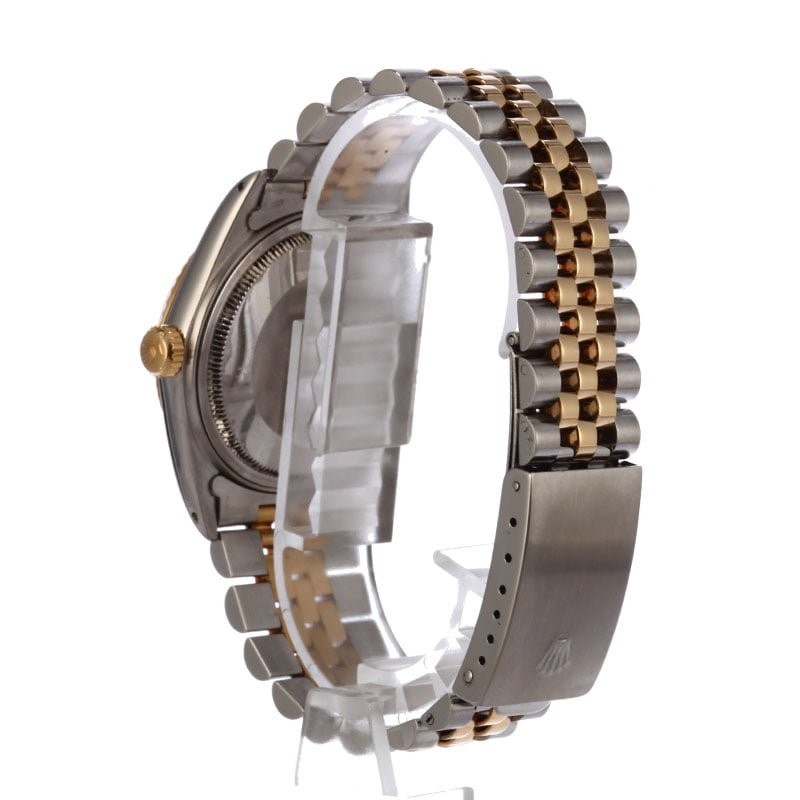 - Case: Stainless steel (36mm) w/ 18k yellow gold Fluted bezel and scratch resistant sapphire crystal