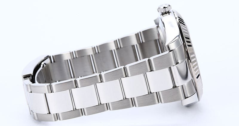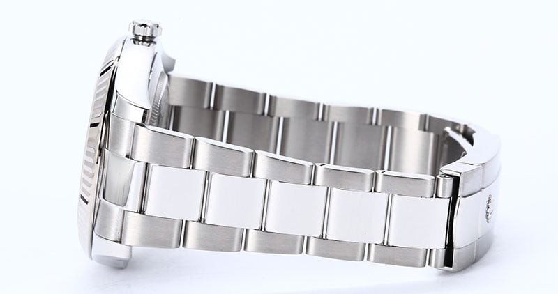 - Case: Stainless steel (41mm) w/ 18k white gold fluted bezel