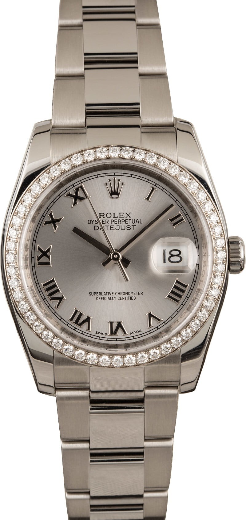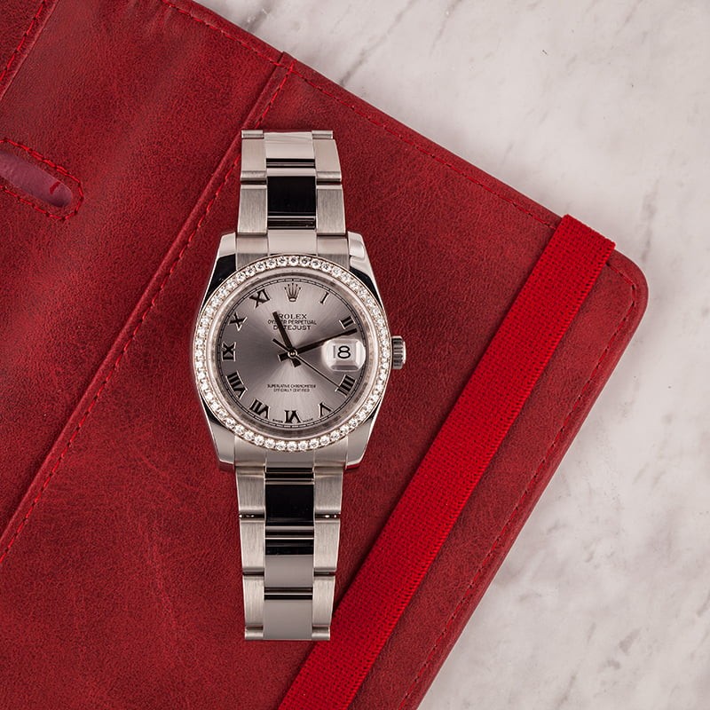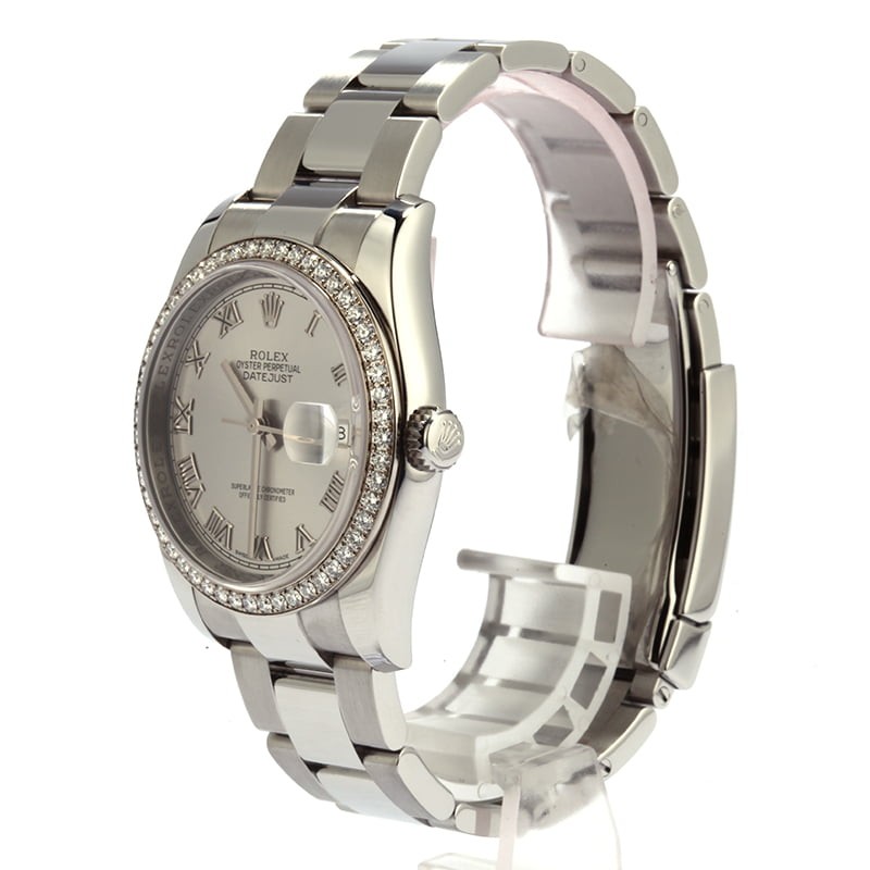 - Case: Stainless steel (36mm) w/ Rolex 52 diamond bezel, inner reflector ring engraved w/ serial number