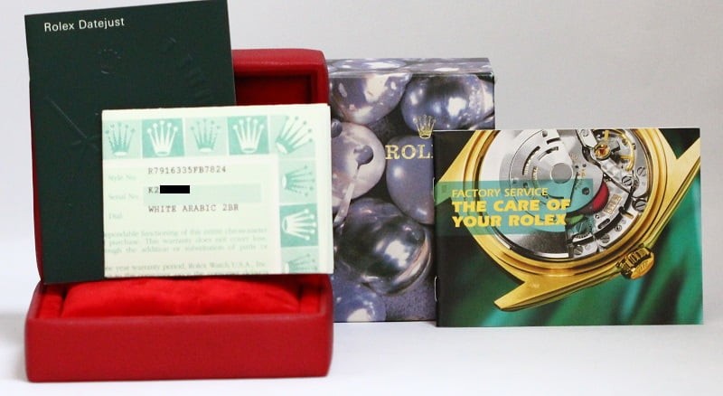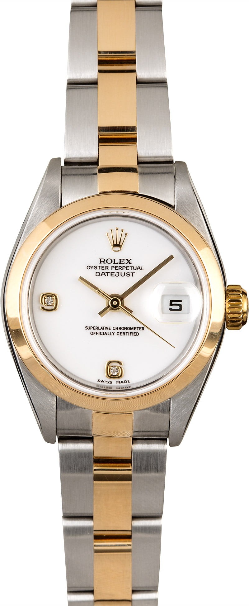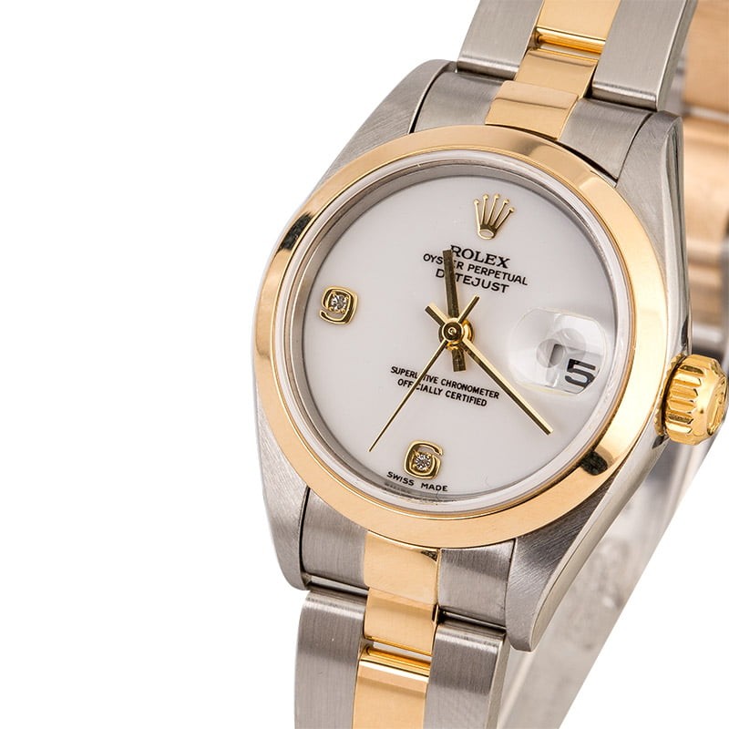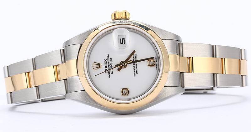 - Dial: White w/ yellow gold Arabic hour markers at 6 and 9 o'clock w/ diamonds