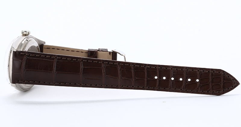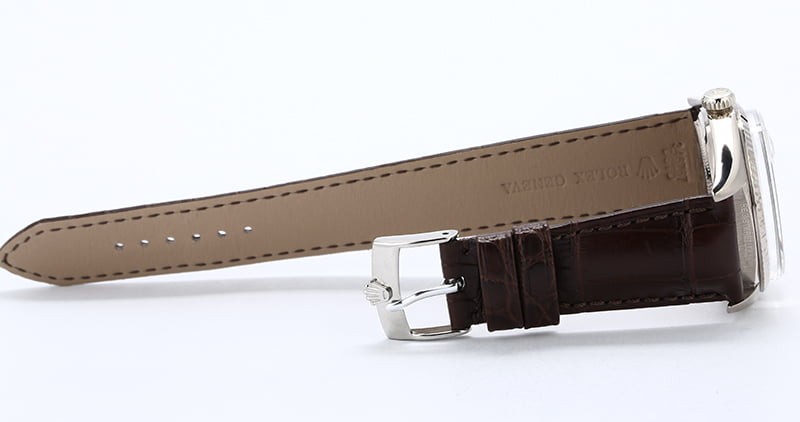 - Bracelet: New brown Rolex Alligator leather strap w/ white gold tang clasp