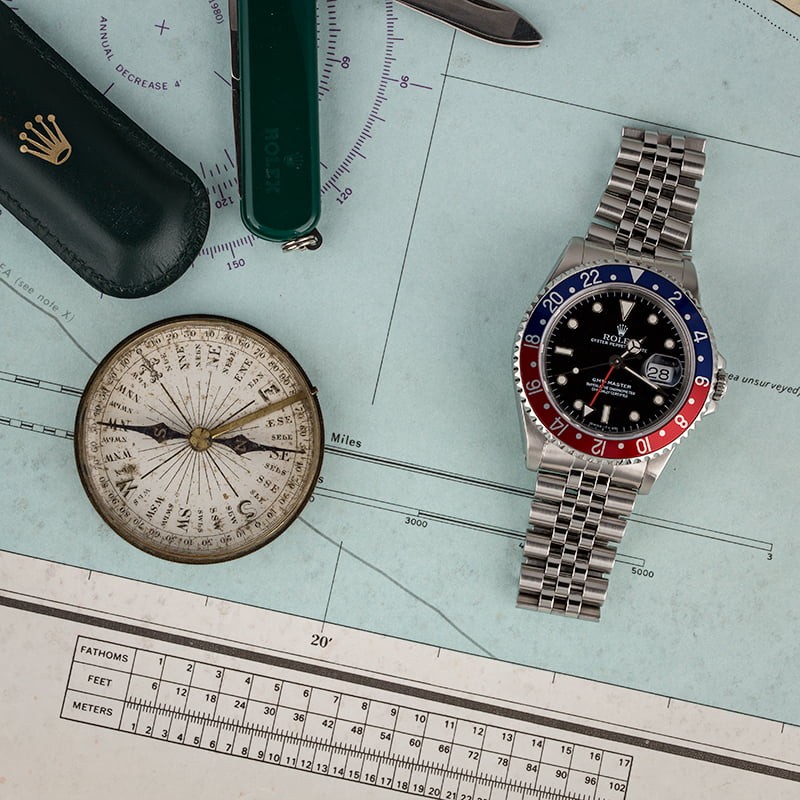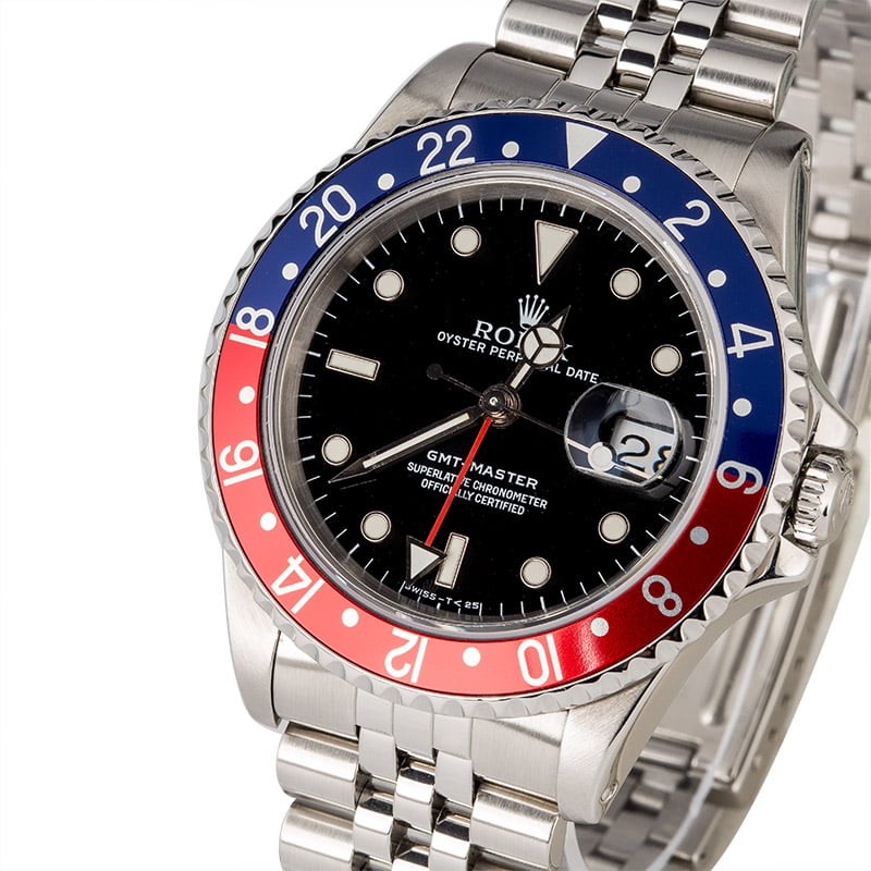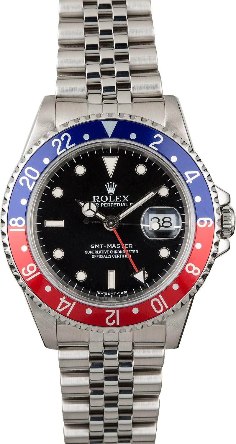 - Case: Stainless steel w/ rotating bezel (40mm) w/ red and blue (Pepsi) bezel insert