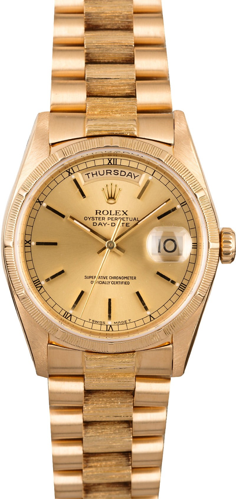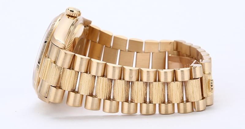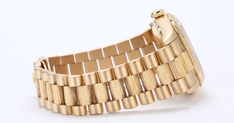 - Bracelet: 18k yellow gold President w/ barked center links w/ hidden Crownclasp