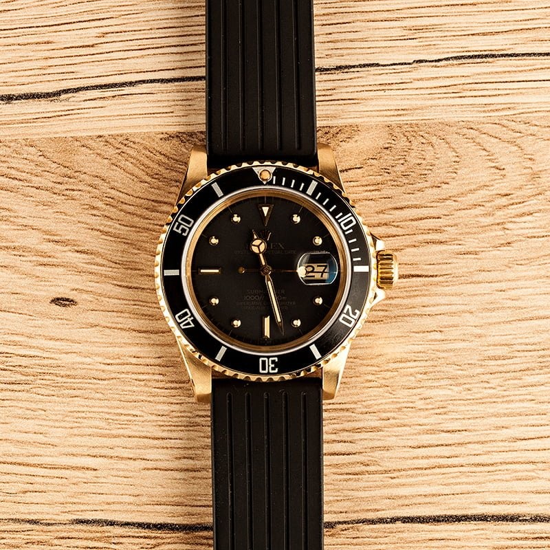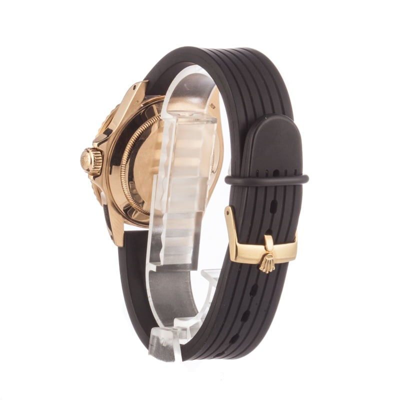 • Bracelet: Black rubber strap w/ 18k yellow gold Rolex tang clasp