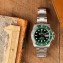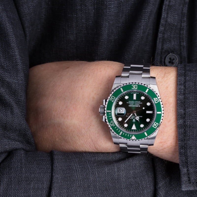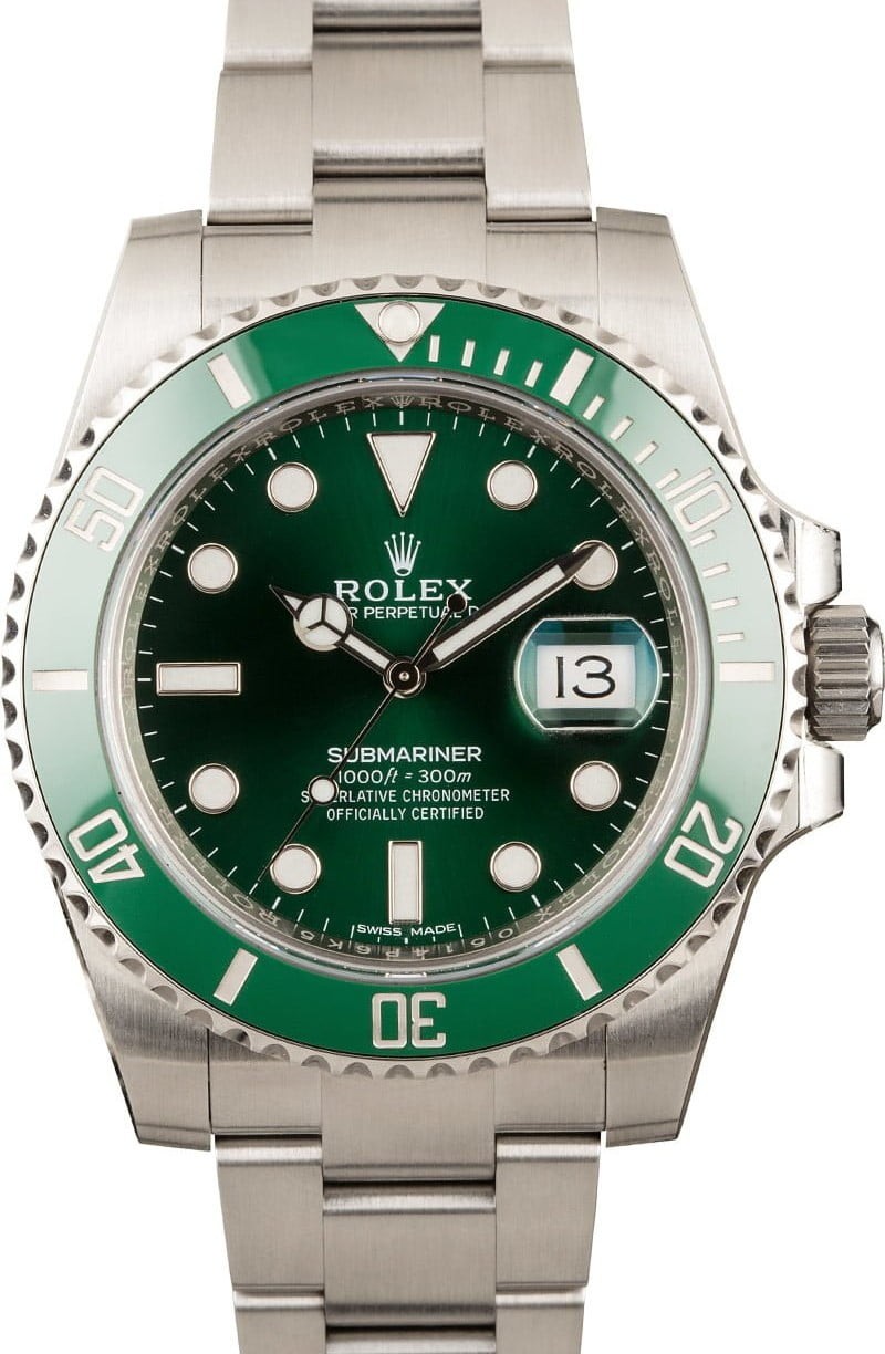 • Case: Stainless steel (40mm) w/ green anniversary ceramic "Hulk" bezel, scratch resistant sapphire crystal, inner reflector ring engraved w/ serial number