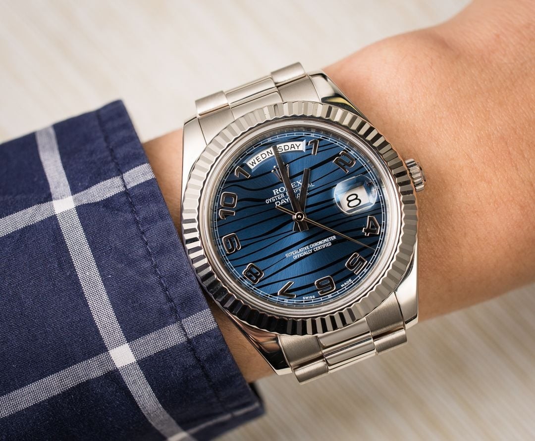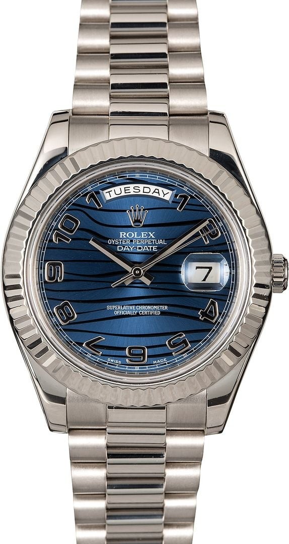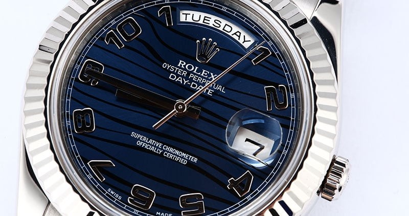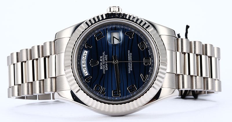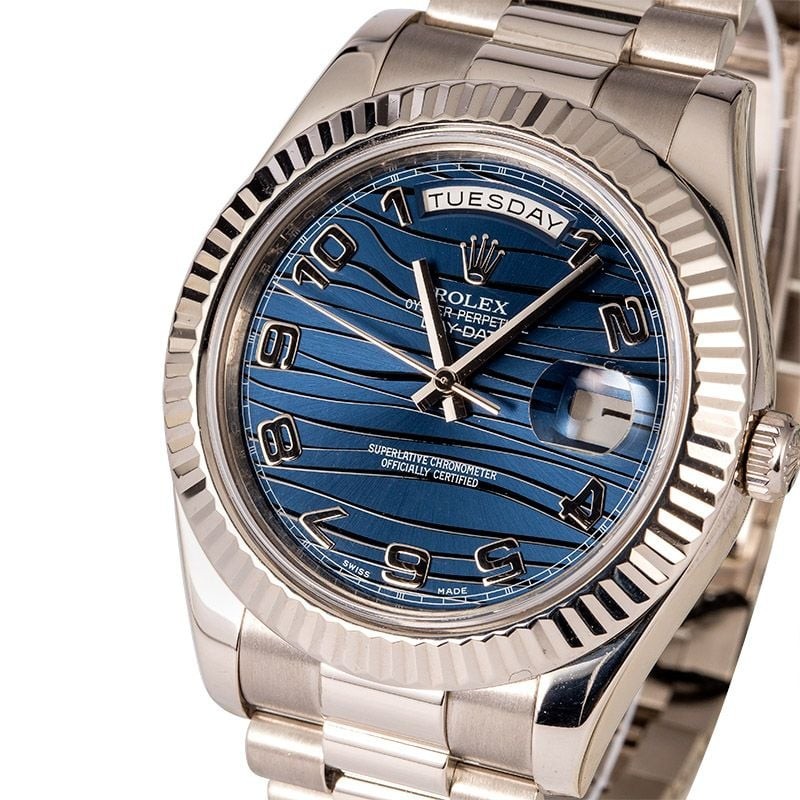 - Case: 18k white gold w/ fluted bezel (41 mm)
